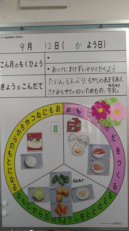 今日は小おかずで「ささみと野菜のいためもの」が提供されています。野菜はピーマンとキャベツが使用されています。塩・こしょう・うすくちしょうゆであっさりと仕上げられています。