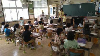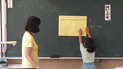 赤えんぴつと青えんぴつの長さ、赤の毛糸と白の毛糸の長さを比べています。どうすれば正しく比べられるか考えています。