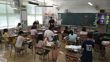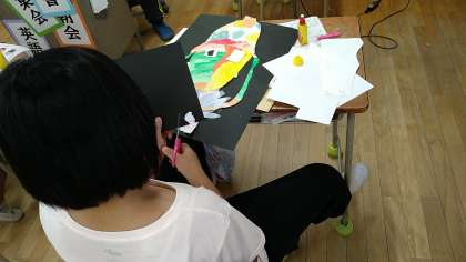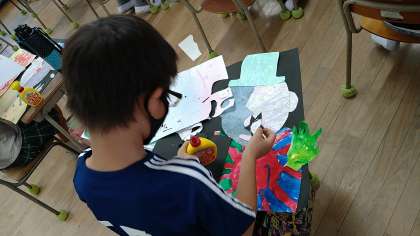 さまざまな技法を使って模様のようにした画用紙を切り取ってピエロを制作しています。黒の色画用紙を背景にしています。