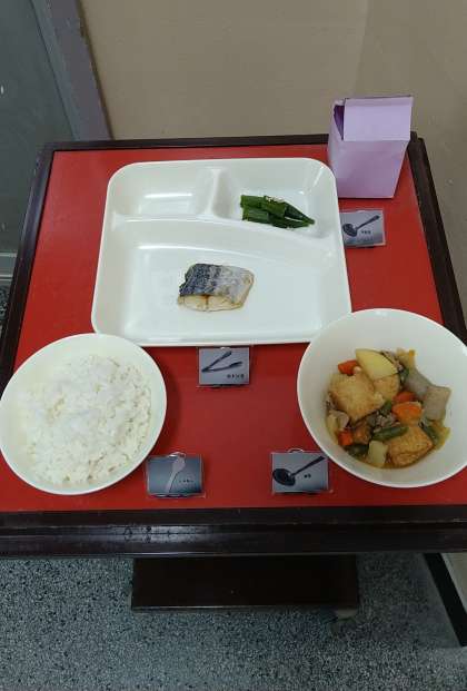 今日は小おかずに「さごしの塩焼き」が提供されています。「サゴシ」は成長すると「ナギ」、「サワラ」と名前を変えます。