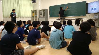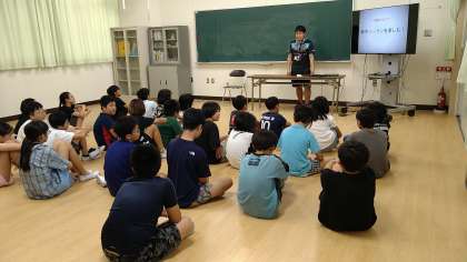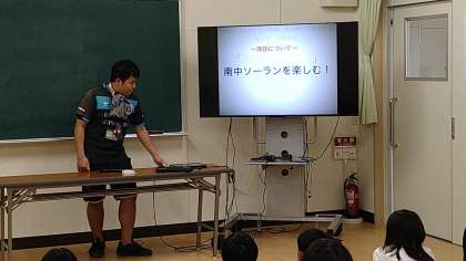 団体演技は「南中ソーラン」、団体競技は「棒引き」、リレーは「2人3脚リレー」、個人走は「障がい物競走」となりました。それぞれの説明をおこなっています。