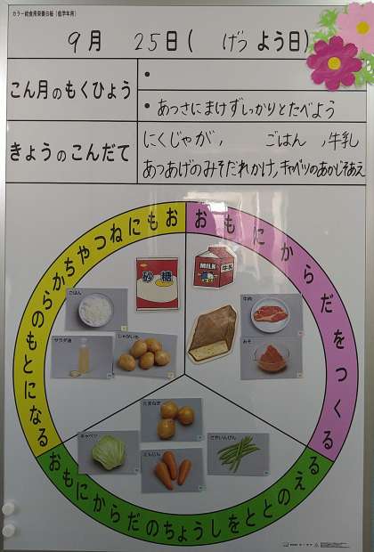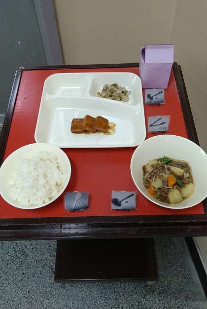 大おかずに「肉じゃが」が提供されています。出汁は、削り節で取っています。人参とさんどまめのオレンジと緑がきれいな色どりとなっています。