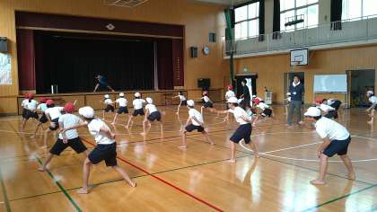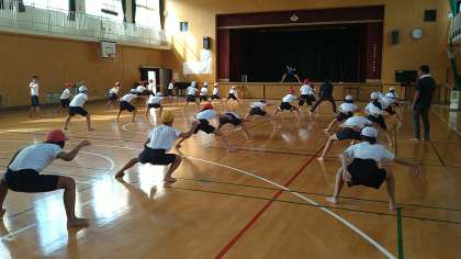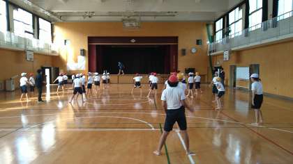 低・中学年と同様に団体演技の練習から始めています。ソーラン節(南中ソーラン)の動きを身につけることから始めています。