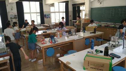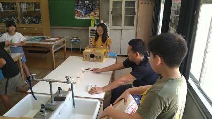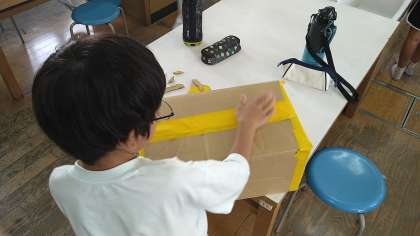 理科室で「空気砲」を作っています。材料はダンボールです。ダンボールに空気が出る穴を空け、隙間をクラフトテープで塞いでいます。空気砲の威力は、火のついたろうそくを5本並べて、何本消えるかで実験しています。