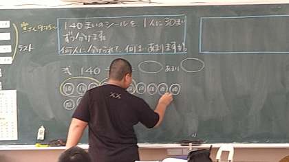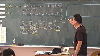 問題は「140まいのシールを1人に30枚ずつ分けます。何人に分けられて何まいあまりますか。」です。あまりの数字がポイントになることを気づかせるように進めています。
