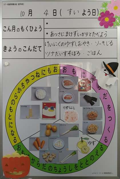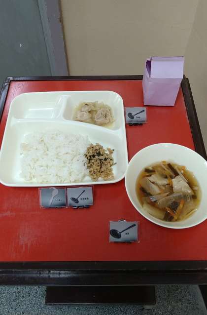 ごはんの添え物(ふりかけ)として「ツナ大豆そぼろ」が提供されています。ツナ(缶詰)・大豆・大根の葉が食材として使用されています。