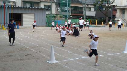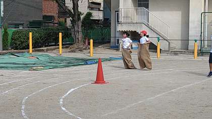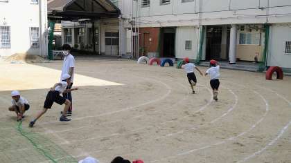 運動会の個人走(障がい物競走)の練習をおこなっています。3・4年は同じコースでおこないます。使用するものは、ネット・ゴム・ドンゴロス(麻袋)の3種類です。