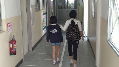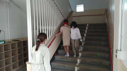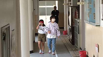 2人1組になり活動しています。教室を出て階段をおり、1階廊下を歩き階段を上り、2階廊下を歩いて教室へ戻るコースです。優しく声をかけて介助しています。