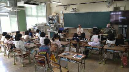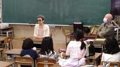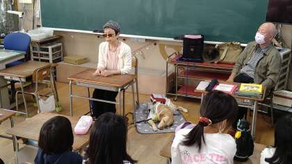 前半は教室で視覚障がいと盲導犬について学習しています。生活で困ることや盲導犬の一生についてていねいにお話していただいています。
