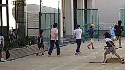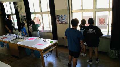運動場では、演技・競技の準備物の用意や放送・ラジオ体操の練習、小石拾いもおこなっています。理科室では、児童が考えた運動会のめあてを窓に貼り付けています。