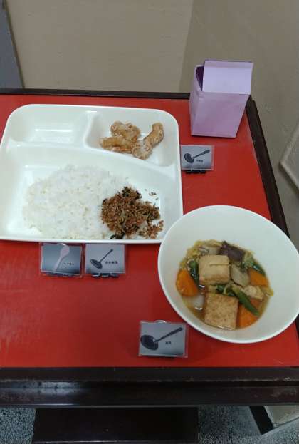 小おかずに「鶏肉のたつたあげ」が提供されています。下味をつけるためのしょうが汁がしっかりと効いています。ごはんが進む味に仕上がっています。