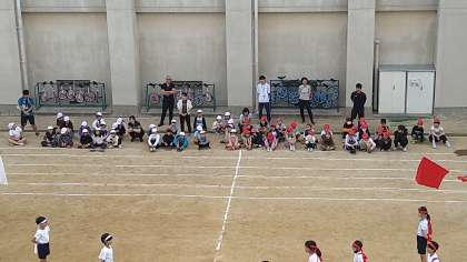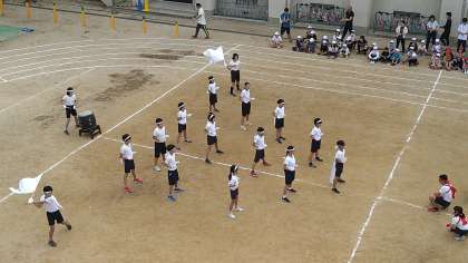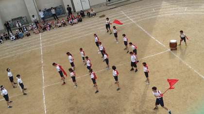 応援団はそれぞれの色の団員の後ろの太鼓の音にあわせて、2拍子・5拍子・337拍子などをおこなっています。その音にあわせて周りの子どもたちが手拍子をしています。