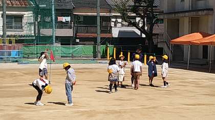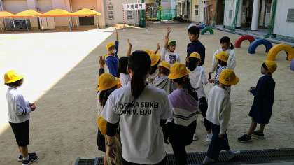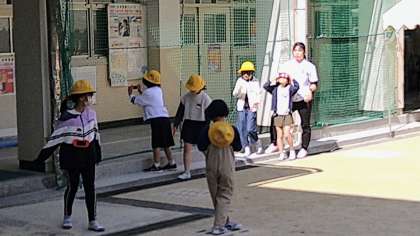 運動場へ出て太陽の動きについて観察しています。観察には、遮光板を使っています。朝に観察した時との違いを比べています。