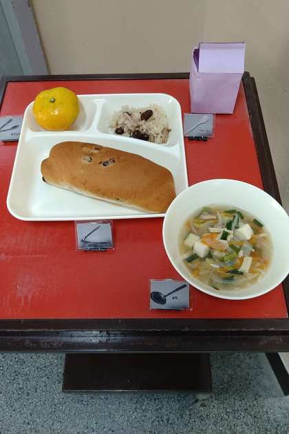 今日は中華メニューとなっています。大おかずは「中華スープ」、小おかずに「金時豆の中華おこわ」が提供されています。