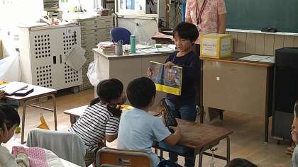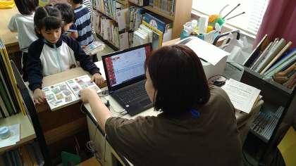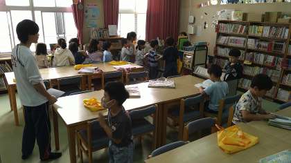 今回は3名の子どもたちが紹介しています。本の題名を紹介し、「読書サイコロ」を回し出目によって本の内容を伝えています。紹介が終わり、図書館で本の借り換えに来ています。