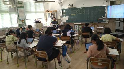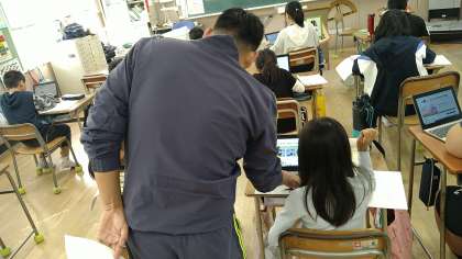 タブレット端末を使いインターネットで検索をして調べています。子どもたちが説明できなかったものを調べています。