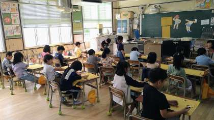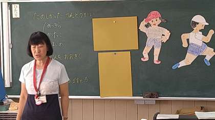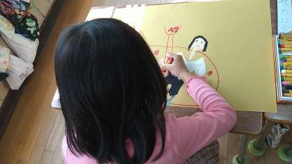 うんどうかい」というテーマでかいています。「めっきらもっきら・かけっこ・玉入れ」から選んでかいています。自分を大きくかくことや腕や足を曲げ伸ばしに気をつけるよう指示しています。