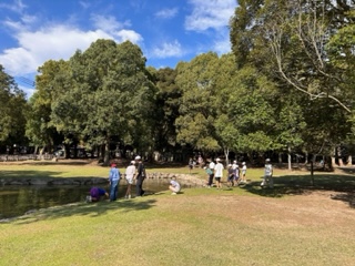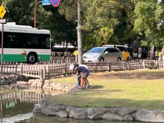 池で生き物を探したり、水切りしたりして遊んでいます。