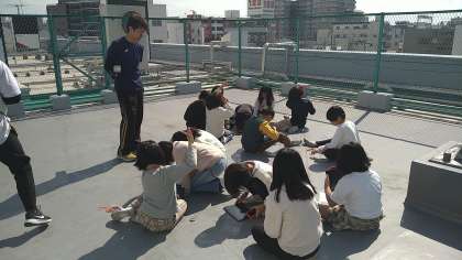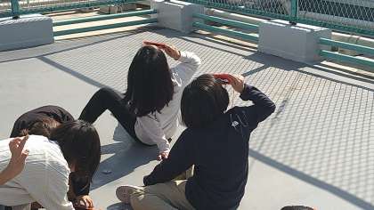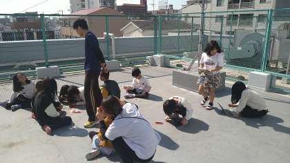 晴れの天気を活用して屋上へあがり、太陽の観察をしています。今日は、およそ1時間毎へ屋上へあがり太陽の動きを観察しています。
