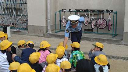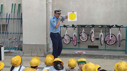 東成警察(交通課)と区役所(安全パトロール担当)のみなさんにお越しいただき交通安全指導をおこなっています。