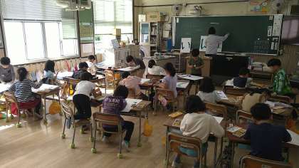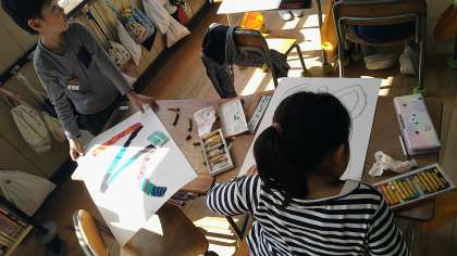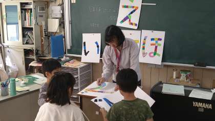 指導者が四つ切の画用紙にひらがな(枠線のみ)を大きくかきます。その中を子どもたちが「しましま(たて・横・ななめ)」「水玉」などカラフルにパスで塗り込んでいます。
