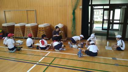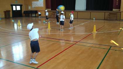 ゲームに入る前に基本的なボールの扱い方や簡単なゲーム遊び(今日は的あて)をしています。まだまだ、投げることに悪戦苦闘しています。