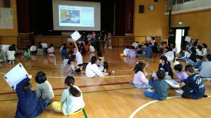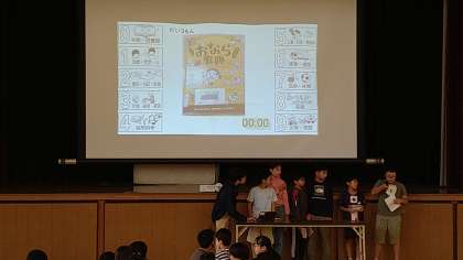つのカテゴリーに分類されています。紹介する本がどれに分類されているかを当てるクイズとなっています。活動はたてわり班でおこなっています。