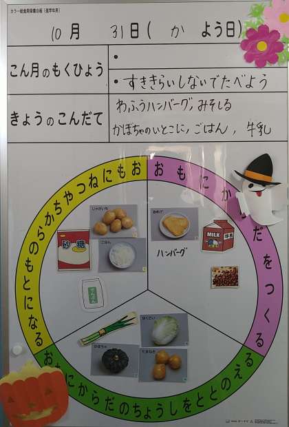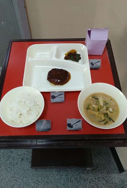 小おかずに「和風ハンバーグ」が提供されています。今回の和風は砂糖・みりん・濃口醤油の照り焼き風の味付けとなっています。
