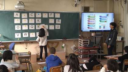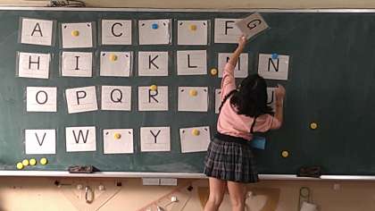 26あるアルファベットを順番に並べて当てるゲームです。答えた児童が次に答える児童を当てています。質問する児童は、「What is