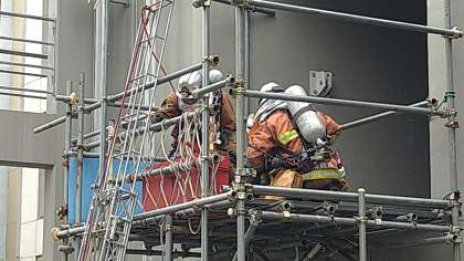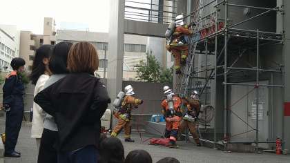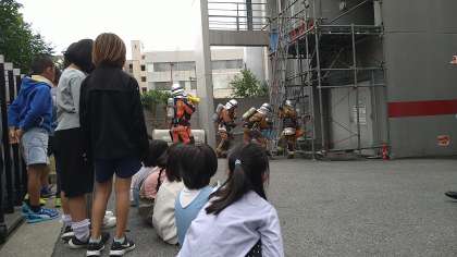 救助訓練の様子を見せていただいています。本来予定されていないものでしたが子どもたちの元気な声のご褒美で見せていただけました。