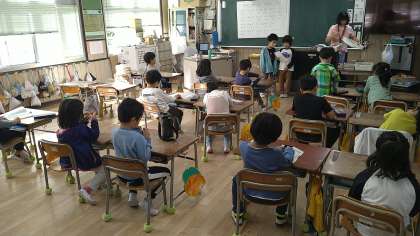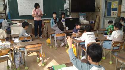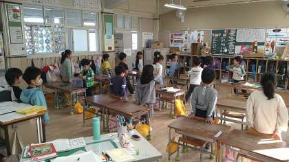 2人の日直が司会進行をおこなっています。学習発表会で朗読する詩を読む練習をしています。出席を確認する時には、子どもたちは返事のあと「はい、元気です。」などと答えています。