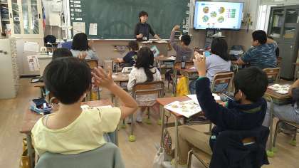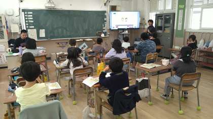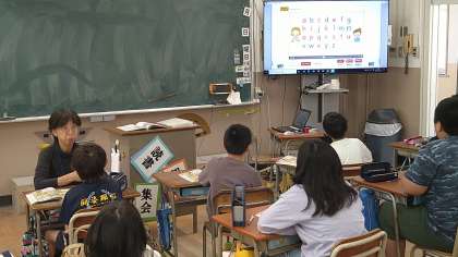 「A」から「Z」のアルファベットをさまざまなリズムで歌っています。そのあと、聞き取りの問題に取り組んでいます。