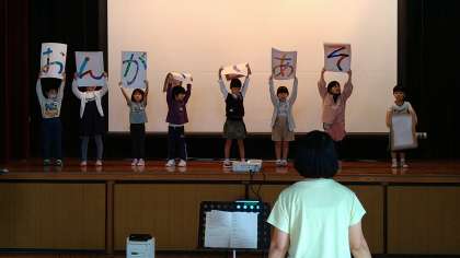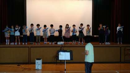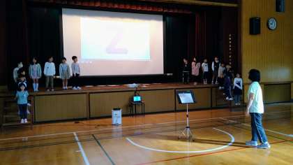 これまで学習して身につけたことを発表します。役割分担をして紹介する場面は、人数が少ないので少し緊張しているように見えます。