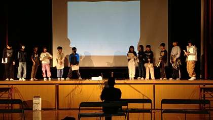 講堂で学習発表会の練習をしています。