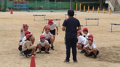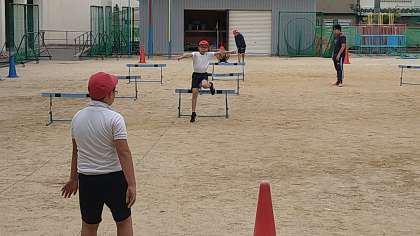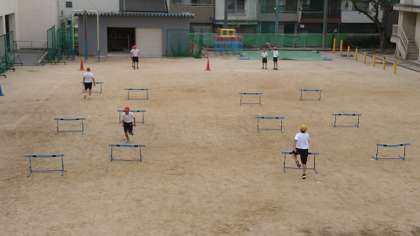 2グループに分かれて練習をおこなっています。前半は、グループごとにハードリングの練習をしています。後半は、リレー競争をおこなっています。6人がリレー形式でハードル走をしたタイムを記録しています。
