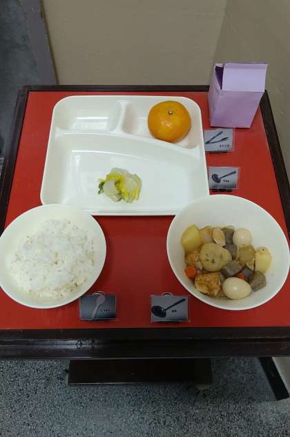 今日は大おかずに「関東煮」が提供されています。具材の「ごぼう平天」「あつあげ」は熱湯をかけ油抜きをしています。こんにゃくも一度茹でてから合わせています。