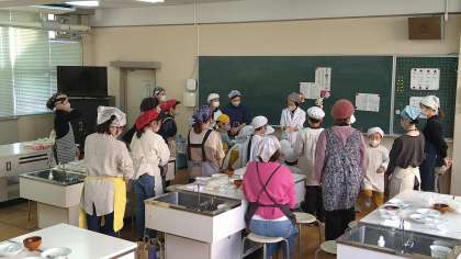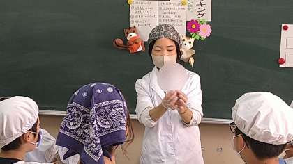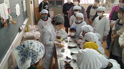 今年のメニューは、「みかん大福」と「チョコバナナ大福」です。初めに栄養教諭から作り方のレクチャーをしています。