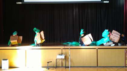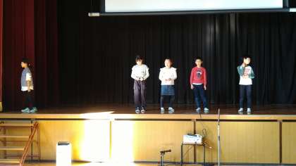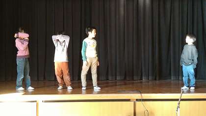 衣装や効果音、歌なども入れて本番さながらの練習をしています。全部で4場面あり、子どもたちの数が少ないので2回(児童によって2役で)出ています。