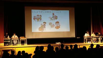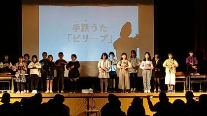 障がい者のみなさんから学ぶ学習をしてきた成果を発表しています。名前を手話でしたり、ビリーブを手話付きの歌で歌っています。