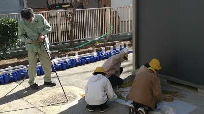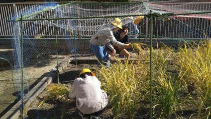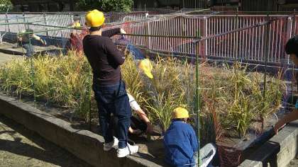 安全のため「鎌」ではなく、「はさみ」で刈り取っています。管理作業員さんが刈り取った稲を干すための場所を作業している脇で作ってくださっています。