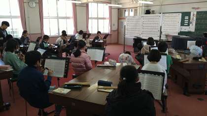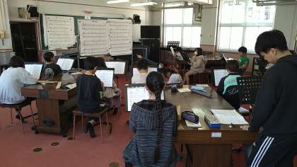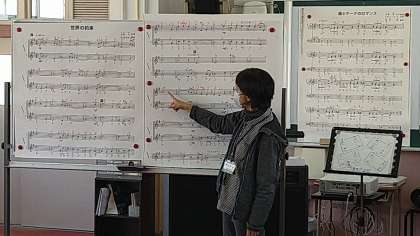 曲名は「世界の約束」です。上下のパートに分かれて演奏します。練習は先週から始まっており、今回が2回目の練習です。ファの「♯」が難しそうです。