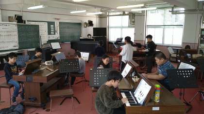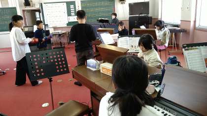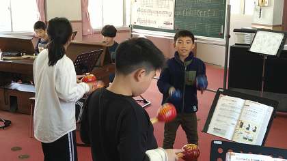 「おどれサンバ」の曲にあわせてマラカスとアンサンブルオルガンを使って演奏を楽しんでいます。3人のマラカスがサンバの感じをより表しています。
