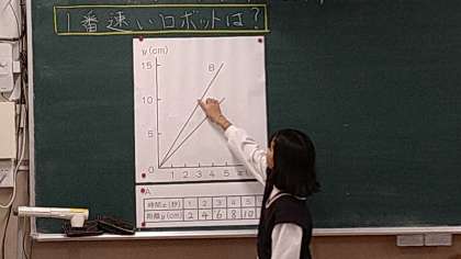 A・B・Cの3種類のロボットがX秒でYcm移動するということを示したグラフと表からどれが1番速いかを考えています。