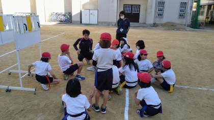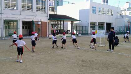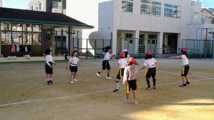 楕円のボールをさわり始めた頃は、取りにくそうに、また投げにくそうにしていましたが、ボールの扱いにかなり慣れてきているのがわかります。陣取りゲームのようになってきています。