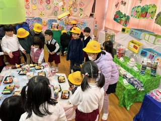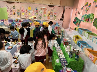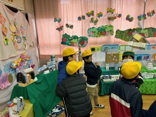幼稚園の作品展にお邪魔しています。部屋いっぱいに飾られた作品を見ています。