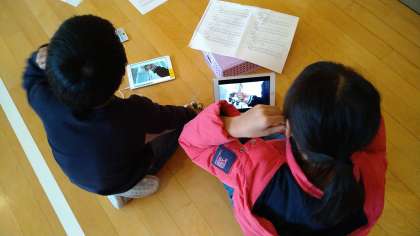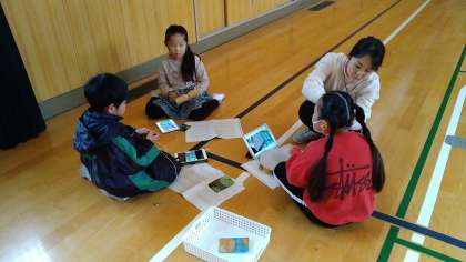 曲名は「ジングルベル」です。使用する楽器は、鍵盤ハーモニカ、鈴、タンバリン、トライアングル、ウッドブロックです。この合奏の練習には、タブレット端末を活用しています。