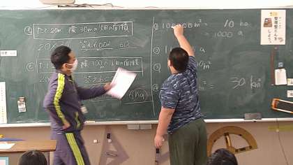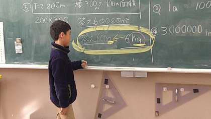 面積を表す単位は、困る子どもたちがたくさんいる学習です。「m?」「a」「ha」「km?」は長さをもとに考えることができますが、なかなか難しいようです。繰り返し指導をしています。