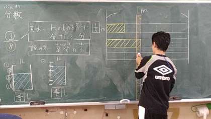 この時間は、分母と分子について学習しています。また、分数の意味と読み方についても説明しています。マスやテープの図をかいて、視覚的にも理解できるようにしています。
