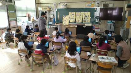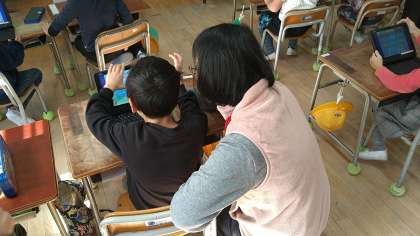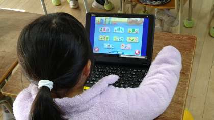 タブレットに入っている学習アプリを使って、国語と算数の振り返りをしています。