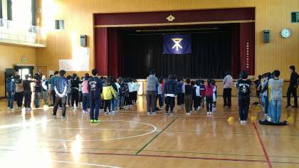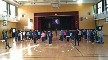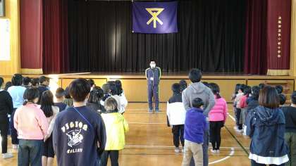 大阪市歌を歌い、校長先生のお話、冬休みのくらしについてお話をしています。最後に東小橋小学校の校歌を歌いました。